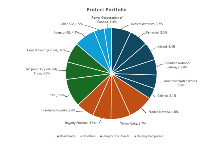 - The one-year return was generated by the Protect side of the Fund with Franco Nevada (FNV) (Gold Royalties), Royalty Pharma (RPRX) (Biopharma Royalties), Ferrovial (FER) (Toll Roads), Investor AB (INVE.B) (Investment Holding Co) top contributors to returns.