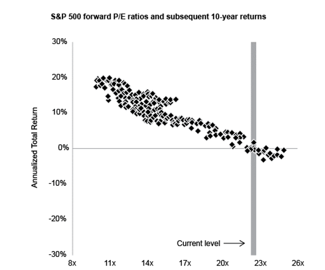 It is important to note that the earnings per share have grown 18% in the same three-year period, with multiple expansion contributing to nearly 40% to the return, with the remainder being dividend income. Following this significant re-rating of earnings, valuation multiples are elevated. The MSCI ACWI trades on a one-year forward PE of 21x and the S&P500 trades on a further premium at 23x earnings. Oaktree Capital’s Howard Marks notes that across 27 years of observations, today’s valuations are in the top decile. At this level, forward returns for investors over the next decade have always been close to zero.
