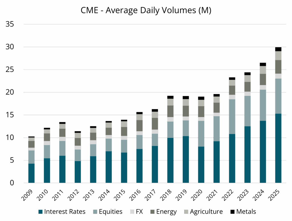 CME has experienced challenges to its dominant status over the years. Notably, Howard Lutnick, ex CEO of BGC and current Secretary of Commerce has attempted to challenge CME twice. First with Electronic Liquidity Exchange (ELX) in 2009, a BGC backed, bank supported US Treasury exchange. Here ELX attempted to undercut fees to no avail; liquidity remained key. ELX was wound down and shut in 2016. Lutnick attempted a sequel in 2024 with the FMX Futures Exchange. This time a BGC led, independent company partially owned by a consortium of banks. The new angle this time was free trading and cross margining leading to capital efficiency. Thus far, traction has been limited – with only a few thousand trades per day, dwarfed by CME’s average daily trading volumes of 5 million. Once again, liquidity is key. A trader paying CME 40-50 cents per contract (with a notional value of hundreds of thousands of dollars), gains 10-30 times the contract fee in cheaper trading execution due to superior liquidity on the CME. Though the threat is not over, we have observed very little traction by FMX across over a year of trading.