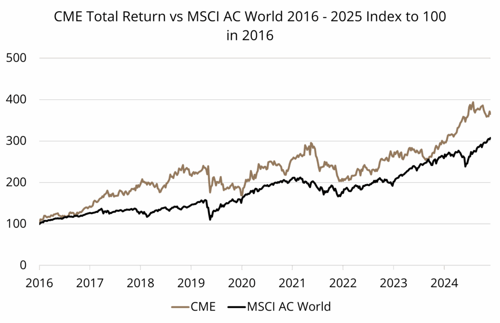 CME is the largest global derivatives exchange operator. The Fund has been invested in CME since early 2024, having also owned the business from 2016 to 2021. Given its royalty like features, CME sits in the Real Assets and Income capital pool of the portfolio.